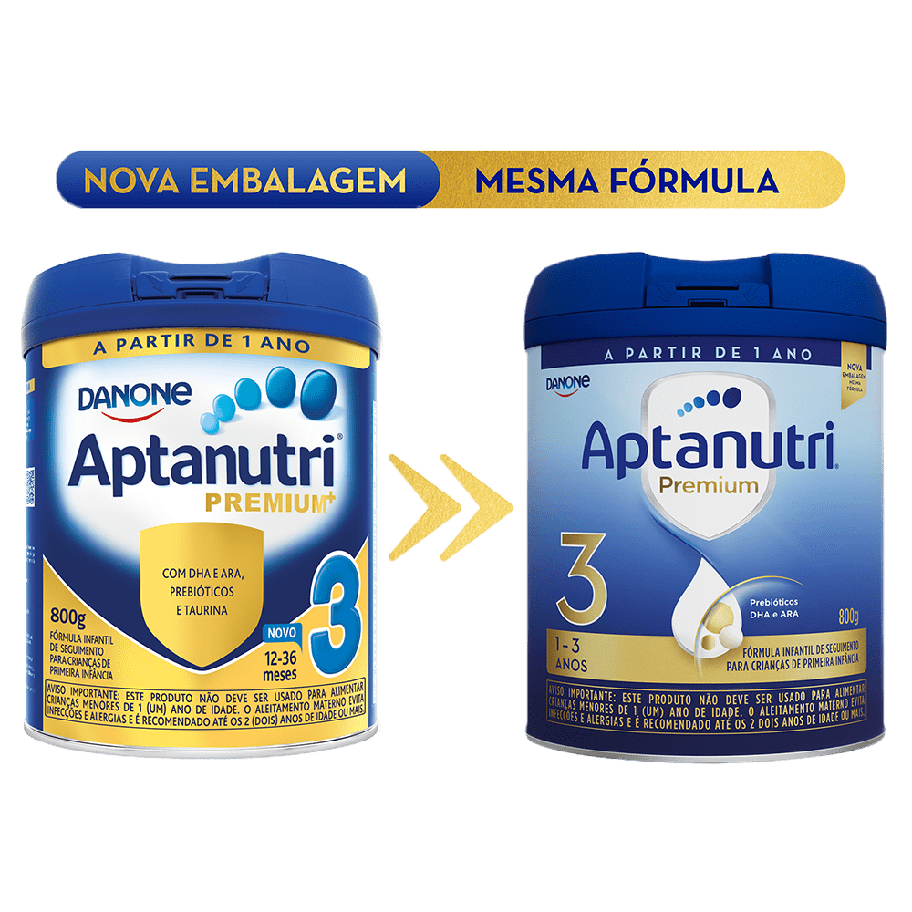 Aptamil Premium 3 agora é Aptanutri Premium 3. É a fórmula infantil de seguimento para crianças de primeira infância da Danone Nutricia, desenvolvida para as necessidades das crianças brasileiras entre 1 e 3 anos de idade. Cmo DHA, ARA, e exclusivos prebióticos.