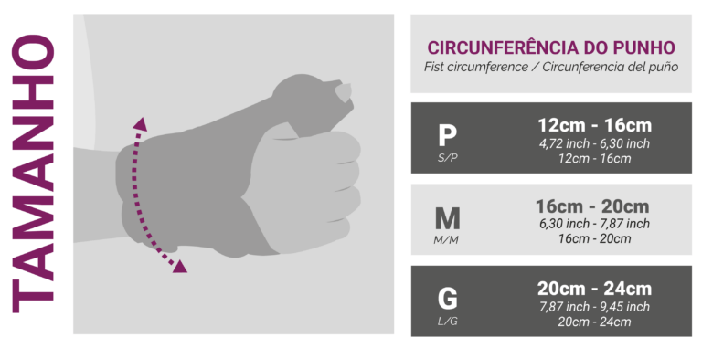 Solte as tiras aderentes de ajuste e vista o produto na mão com o auxílio do suporte interno e o polegar posicionado no orifício superior. Os demais dedos devem ficar livres. Ajuste as tiras aderentes no dorso da mão e por fim aplique a compressão desejada e necessária no fecho com tira aderente do polegar.