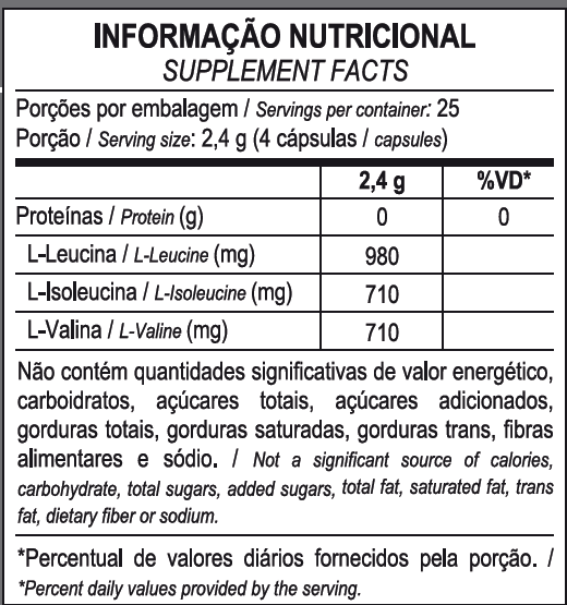 Ingredientes principais: Leucina, Isoleucina, Valina com selo PURE AMINO ACID by Ajinomoto Co.® Conteúdo: 100 cápsulas Indicado para: quem busca alta performance, recuperação muscular rápida e qualidade comprovada.