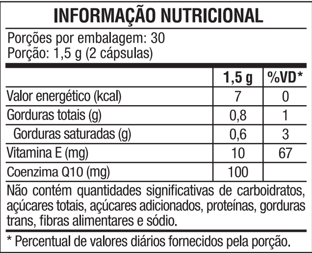 Triglicerídeos de cadeia média, coenzima Q10, DL-alfa-tocoferol (vitamina E), corante natural de urucum e dióxido de silício. Cápsula: gelatina, água purificada e glicerina. Não contém glúten.