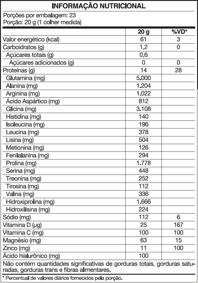 Colágeno hidrolisado, L-glutamina, hialuronato de sódio, ácido ascórbico (vitamina C), bisglicinato de magnésio, bisglicinato de zinco, colecalciferol (vitamina D3), aroma idêntico ao natural de morango, acidulante ácido cítrico, dióxido de silício, goma xantana, corante carmim e edulcorantes naturais (estévia e taumatina).