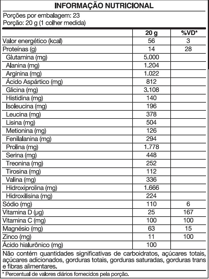 Colágeno hidrolisado, L-glutamina, bisglicinato de magnésio, hialuronato de sódio, ácido ascórbico (vitamina C), bisglicinato de zinco, colecalciferol (vitamina D3), dióxido de silício e goma xantana.