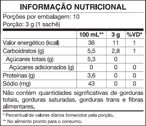Mix de enzimas (bromelina, alfa-amilase, protease, lactase e lipase), maltodextrina (agente de massa) e dióxido de silício (antiumectante).