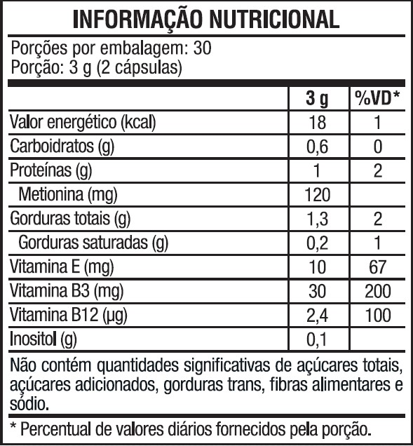 Lecitina de soja, óleo de semente de uva (Vitis vinifera L.), L-metionina, inositol, niacinamida (vitamina B3), acetato de DL-alfa-tocoferol (vitamina E), metilcobalamina (vitamina B12) e corante clorofila. Cápsula composta por gelatina, água purificada e umectante glicerina.