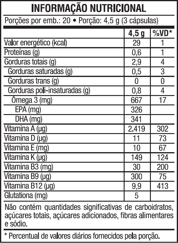 - Cápsulas softgel de fácil ingestão, sem glúten e com alta biodisponibilidade dos nutrientes.