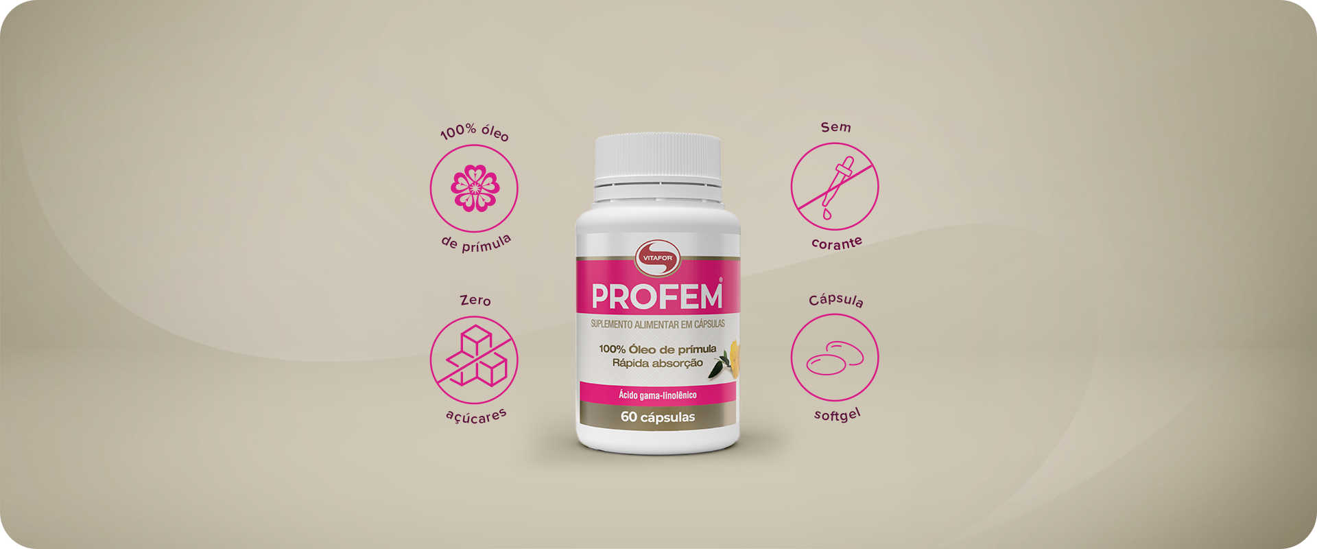 PROFEM® é um suplemento alimentar formulado com 100% óleo de prímula, fonte natural de ácido graxo essencial Ômega-6, especialmente rico em ácido gama-linolênico (GLA). Indicado para mulheres a partir de 15 anos, ele é seu aliado diário para amenizar os desconfortos da tensão pré-menstrual (TPM) e promover equilíbrio e qualidade de vida.