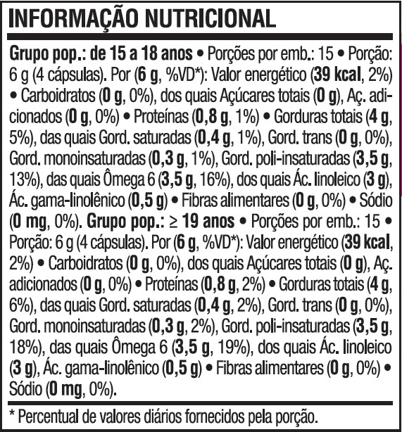 - Alta concentração de ácido gama-linolênico (GLA), que ajuda a reduzir sintomas como irritabilidade, inchaços e dores de cabeça;