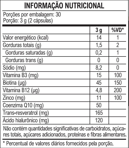 Óleo de semente de uva (Vitis vinifera L.), trans-resveratrol sintético, hialuronato de sódio (ácido hialurônico), bisglicinato de zinco, coenzima Q10, niacinamida (vitamina B3), metilcobalamina (vitamina B12), D-biotina (vitamina B7), corante natural urucum e dióxido de silício. Cápsula softgel composta por gelatina, água purificada e glicerina.