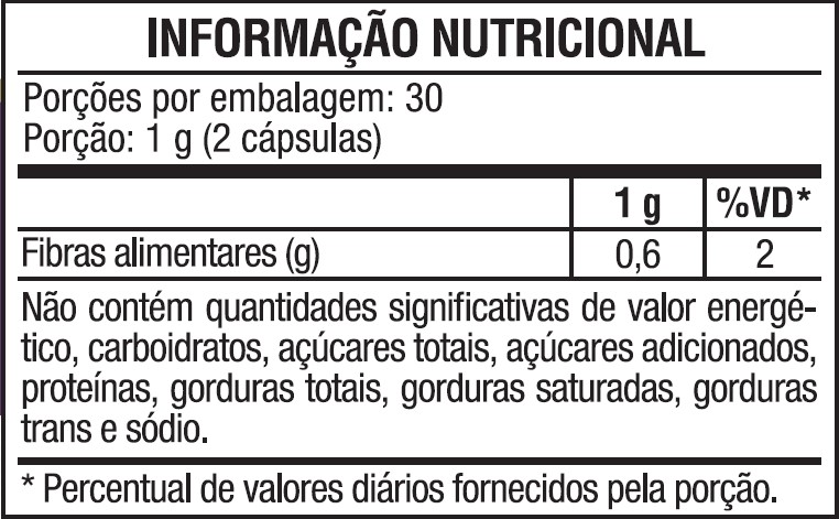Cápsula vegetal composta por hidroxipropilmetilcelulose (HPMC), água purificada, carragena e reguladores naturais de acidez.