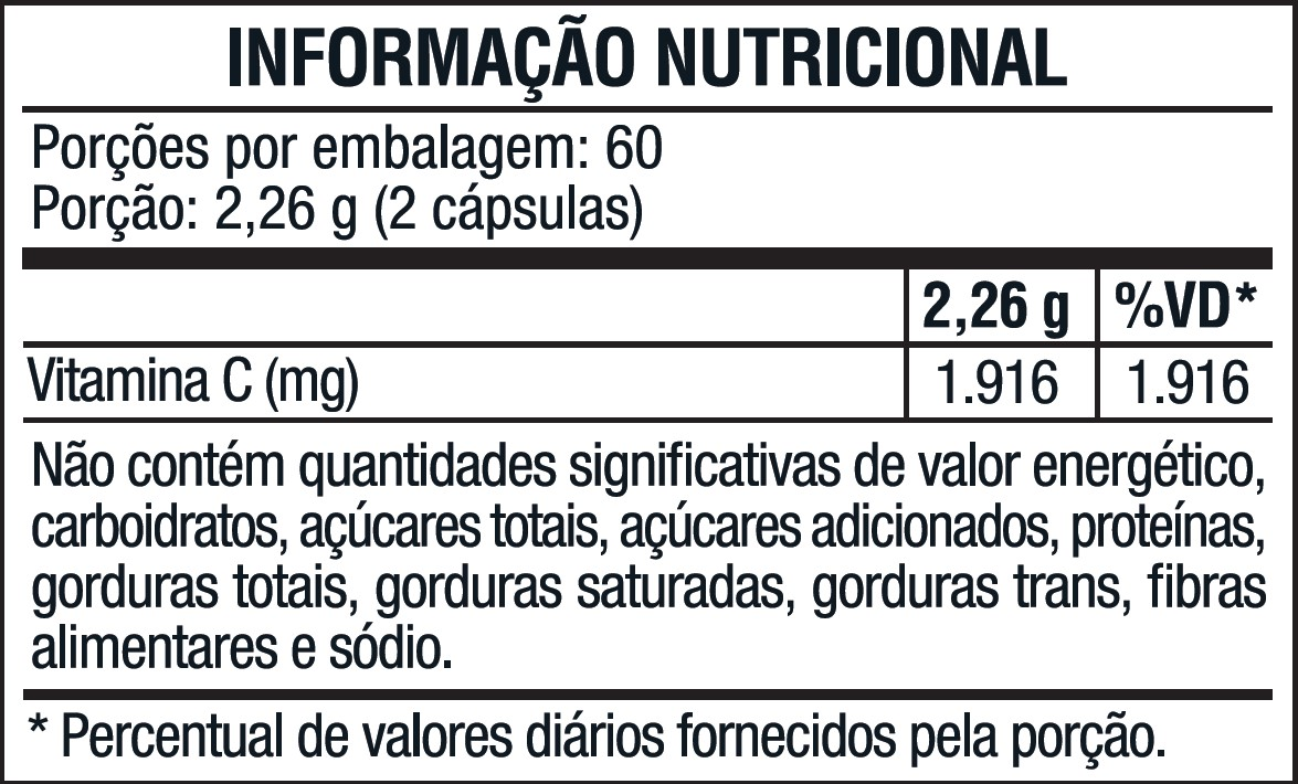 Ácido ascórbico, ascorbato de sódio, palmitato de ascorbila e antiumectante estearato de magnésio. A cápsula é composta por hidroxipropilmetilcelulose (HPMC), água purificada, opacificador (corante carbonato de cálcio e amido modificado), gelificante carragena e regulador de acidez acetato de potássio.