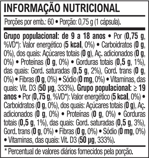 Vitafor Vita D3® apresenta a vitamina D3 (colecalciferol) em cápsulas softgel de rápida absorção, com 2.000 UI por cápsula para facilitar a suplementação e garantir níveis adequados dessa vitamina essencial.