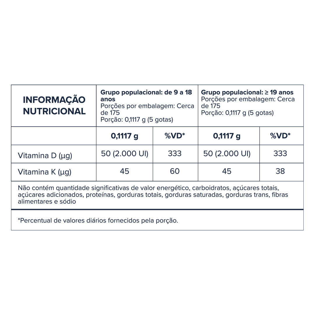 Triglicerídeos de cadeia média, menaquinona-7 (vitamina K2), colecalciferol (vitamina D3), aroma natural de menta e antioxidante dl-alfa-tocoferol. Produto não contém glúten.